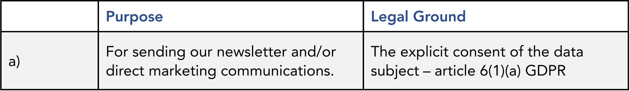 The overview below shows for what purposes and on what legal basis we process Subscribers’ personal data:
